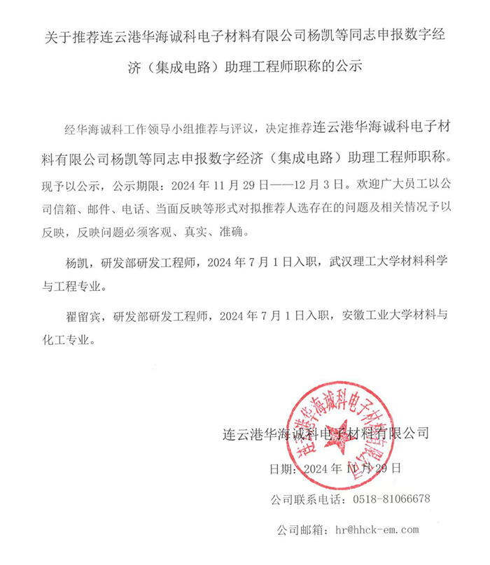 經(jīng)華海誠科工作領(lǐng)導(dǎo)小組推薦與評(píng)議,決定推薦連云港華海誠科電子材料有限公司楊凱等同志申報(bào)數(shù)字經(jīng)濟(jì)(集成電路)助理工程師職稱?,F(xiàn)予以公示,公示期限:2024年11月29日——12月3日。歡迎廣大員工以公司信箱、郵件、電話、當(dāng)面反映等形式對(duì)擬推薦人選存在的問題及相關(guān)情況予以反映,反映問題必須客觀、真實(shí)、準(zhǔn)確。